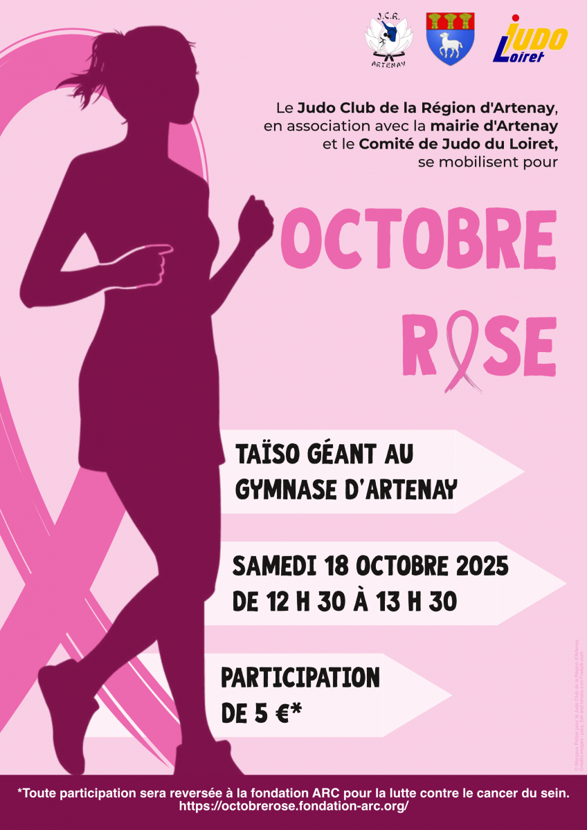 Le Judo Club de la Région d'Artenay se mobilise pour Octobre rose et organise un taïso géant, dirigé par Clément, le samedi 18 octobre 2025 de 12 h 30 à 13 h 30 au gymnase communautaire d'Artenay.